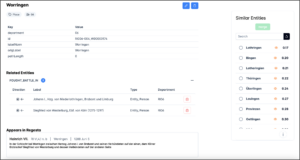 Entity Manager is a web application that enables knowledge management for digital editions (Fig. 3). It is currently being developed specifically for Regesta Imperii but is based on the generic RAMEN model and can therefore be used for any projects that use this model. It enables the creation and editing of entities. In this context, entities are, for example, persons, places, roles, or other project-specific things. Properties can be assigned to entities (e.g., date of death, alternative spellings, Wikidata ID, etc.), as is typical for knowledge management. In addition, entities can be linked to each other. The networking options are open and can be defined on a project-specific basis, regardless of whether they involve relationships, political networks, or subordination of concepts. The Entity Manager can also be used for existing projects and offers helpful functions for cleaning up data and, for example, finding and merging duplicates.